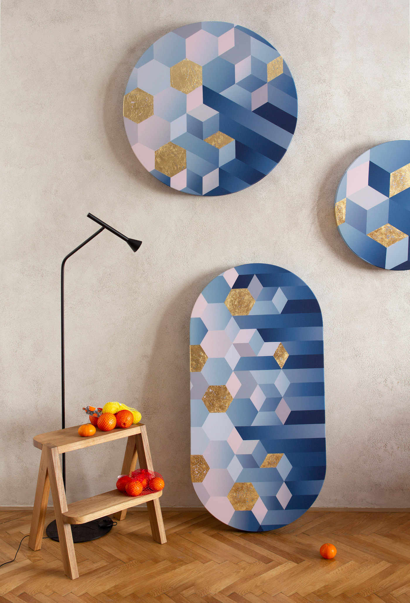 A trio of decorative acoustic panels has been created for a private apartment space. The architect matched the interior elements to the Art Deco style, which is also reflected in the visual appearance of the panels. The details were enlivened by the application of gilded metal.